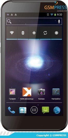 The second model was found smartphone teXet TM-5377. The device has a large 5.27-inch IPS display with a resolution 960h540 pixels and multitouch on 5 touches. Responsible for performance MT6577 dual core CPU with a clock speed of 1 GHz, gigabytes of RAM and a PowerVR SGX graphics accelerator 531. Like most of the company's devices, the smartphone supports simultaneous work with two SIM-cards. Resolution main camera is 8 megapixels, while the front - 2 megapixels. The main camera is equipped with autofocus and LED flash. Data storage has 4 gigabytes of internal memory which can be increased by another 64 GB using a memory card. Battery capacity of 2700 mAh enough to 16.2 hours of talk time or 540 hours of standby time. When surfing the Internet battery will last for 7.5 hours. Dimensions of the smartphone are 144.8x77.5h10.8 mm and weight -133.9 grams. The operating system uses Android 4.0.4 Ice Cream Sandwich.