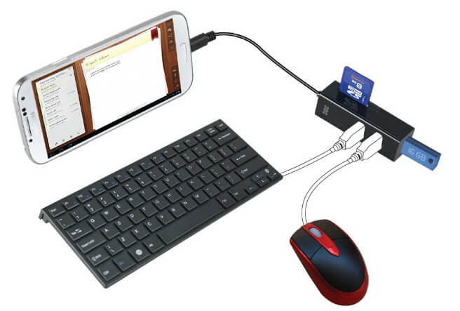 Возможности Android позволяют без проблем работать со смартфоном и клавиатурой (мышкой) без всяких ограничений (ранее мы писали как поключить мышку к Андроид телефону). Прекрасно будет, если мышка и клавиатура имеют один приёмник. Иначе придется искать работающий USB разветвитель, который придется поискать отдельно.