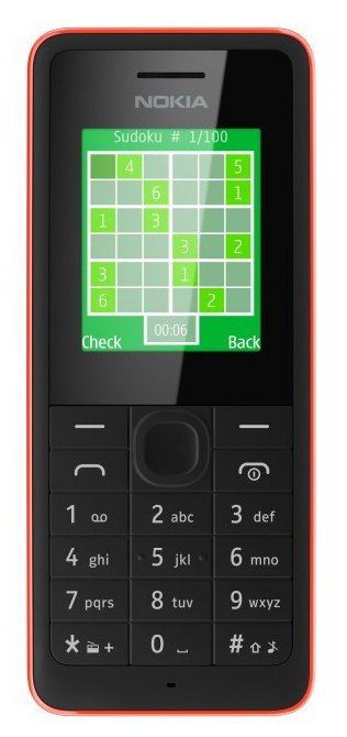 Сотовый телефон Nokia 106 анонсирован брендом Nokia. По своим очертаниям гаджет имеет форму моноблок, а его размеры равны 112.9 x 47.5 x 14.9 mm, а масса 74.2 g. В телефоне устанавливается батарейка Li-Ion 800 mAh (BL-5CB). Как сообщает предприятие среднее время разговора до Up to 10 h работа в период ожидания до Up to 840 h. В Nokia 106 используется дисплей 1.8 с разрешением 128 x 160 pixels. Ёмкость постоянной памяти 384 kB RAM, наращивается с помощью носителя нет. .