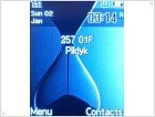 Меню представляет собой матрицу 3×3 (журнал звонков, телефонная книга, программы, браузер, сообщения, мои файлы, календарь, камера, настройки), рядом с которой оказывается увеличенная иконка выбранного объекта. Дополнительно иконка выделяется цветом. В большинстве пунктов меню и программ нашлось место для статусной строки со временем и зарядом аккумулятора.